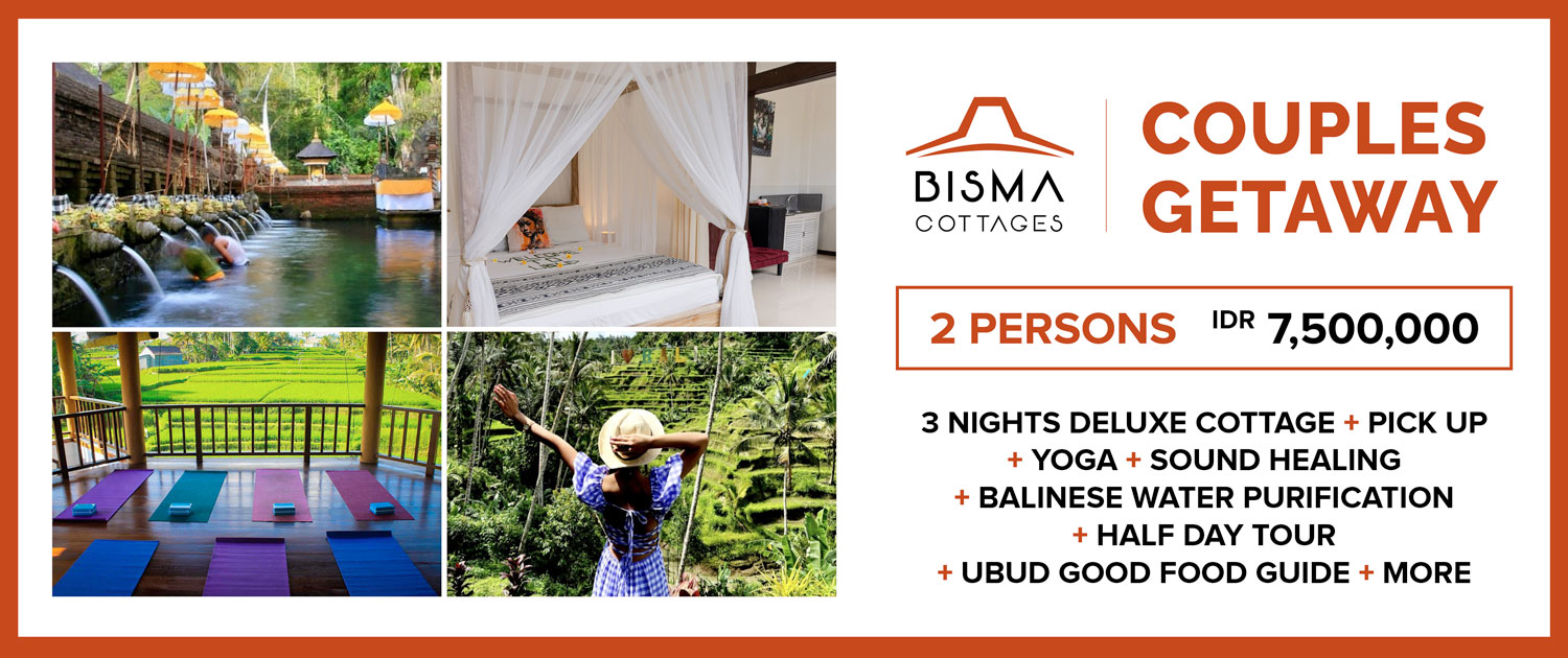 Rejuvenate, relax and have some fun with this 3 Night Couples Getaway Package in Ubud. Bali’s wellness hub and the best location for nature activities. Stay in a Deluxe Cottage overlooking rice fields, just 15 minutes walk from central Ubud. This Couple Getaway Package is designed for busy couples who rarely get to unwind together, offering an easy paced two day itinerary.