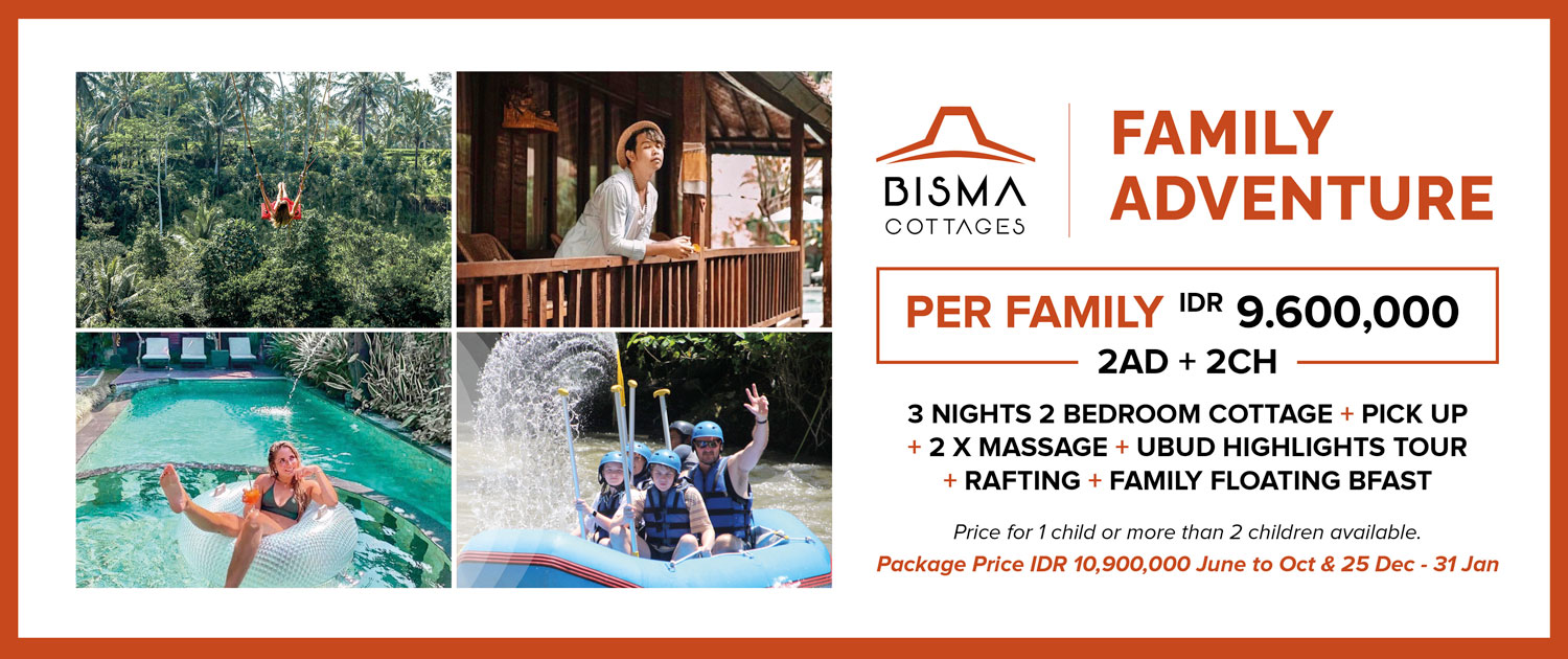 This package is designed to keep children active and entertained whilst experiencing the Ubud area’s nature and culture. Bisma Cottages 2 Bedroom Cottages are perfect with families with children who want to be close to parents but not sharing the same room. Due to the activities and accommodation style the Family Adventure is recommended for children 8 years and older. Mum and Dad need a holiday break too so included is 2 x 60 minute Balinese Massages.